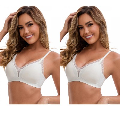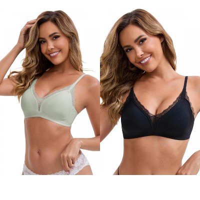 INSPIRE CHIC Women's Lace Trim Plunge Wireless Push Up Spaghetti Straps Lightweight No Show Everyday Triangle Bras 2 Packs