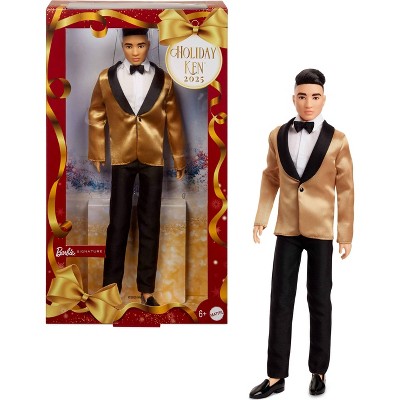 Barbie Signature 2025 Holiday Black Hair Ken Collectible Fashion Doll wearing Full Suit with Golden Jacket
