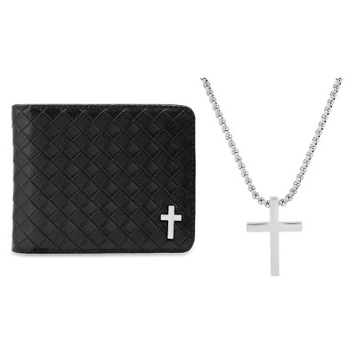 Steeltime Men's Braided Black Vegan Leather Lionhead Wallet and Lion Head Pendant Set