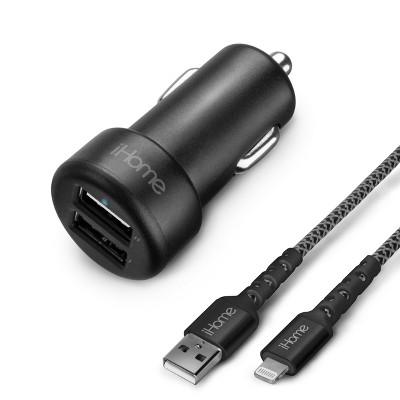 iHome 3.4A Dual Port Car Charger with 6ft Lightning Cable, Fast 12W Charging, Compact Design