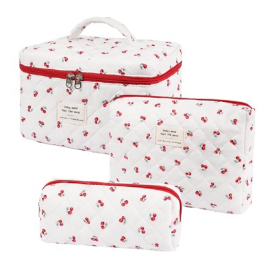 Narwey Quilted Makeup Bag Set - 3 PCS Cute Floral Cotton Makeup Bag, Large Coquette Aesthetic Make up Cosmetic Bag