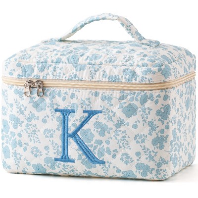 Narwey Initial Quilted Makeup Bag, Cotton Large Travel Makeup Bag, Cute Floral Coquette Make up Bag Cosmetic Bag Toiletry Bag for Women Girls L