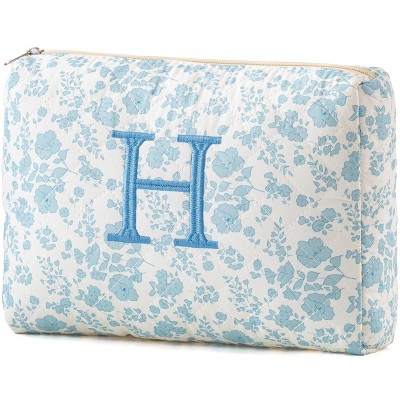 Narwey Initial Quilted Makeup Bag, Cotton Large Travel Makeup Bag, Cute Floral Coquette Make up Bag Cosmetic Bag Toiletry Bag for Women Girls H