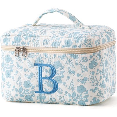 Narwey Initial Quilted Makeup Bag, Cotton Large Travel Makeup Bag, Cute Floral Coquette Make up Bag Cosmetic Bag Toiletry Bag for Women Girls B