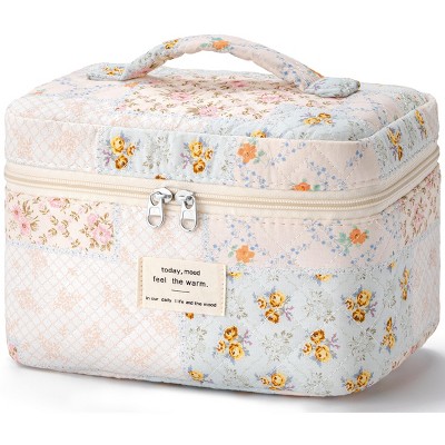 Narwey Large Quilted Makeup Bag, Cute Cotton Travel Cosmetic Bag with Handle, Gifts for Bridesmaids, Portable Coquette Floral Make up Bags