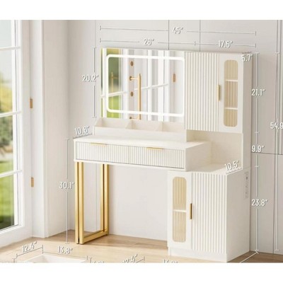 Vanity Desk with Lighted Mirror and Jewelry Storage, White and Gold Makeup Table with LED Cabinet, Vanity Table with Drawers, Shelves