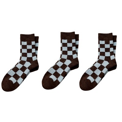 Anna-Kaci Women's 3-Pair Checkerboard Crew Socks Soft Knit Fabric Ribbed Cuff Comfortable Everyday Giftable Sock Set - Beige+Brown