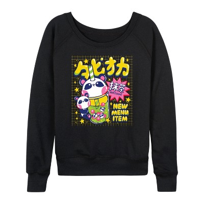 Women's - Instant Message - Kawaii Match Bear Boba Tea Lightweight French Terry Wide Neck Long Sleeve Graphic Shirt