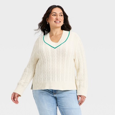 Women's Long Sleeve Cable Knit V-Neck Pullover Sweater - Ava & Viv™