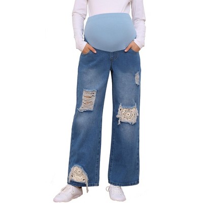 INSPIRE CHIC Women's Maternity Jeans Ripped Distressed Lace Patchwork Over the Belly Support Pregnancy Denim Pants