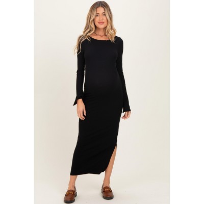 Hello Miz Women's Ribbed Sweetheart Neck Long Sleeve Back Slit Maternity Midi Dress