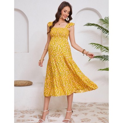 Coolmee Women Maternity Summer Short Sleeve Smocked Boho Dress Casual Square Neck Ruffle Midi Dress Baby Shower Photoshoot