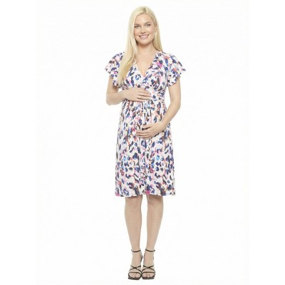 24seven Comfort Apparel Maternity Abstract V Neck Cap Sleeve Knee Length A Line Pocket Dress