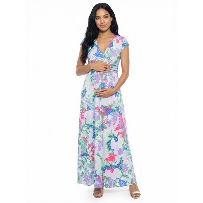24seven Comfort Apparel Maternity Floral V Neck Cap Sleeve Side Slit Pocket Maxi Dress
