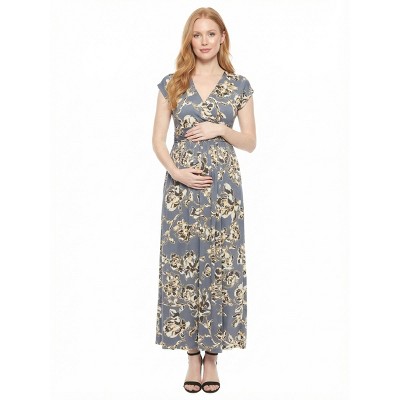 24seven Comfort Apparel Maternity Gray Floral Print Long Sleeve Wrap Maxi Dress