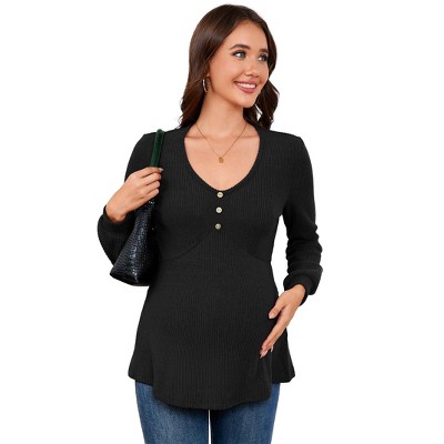 Hello Miz Women's Long Sleeve Ribbed Collared V Neck Maternity Midi Nursing Friendly Dress