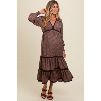 Pinkblush Brown Floral Lace Trim Bubble Sleeve Maternity Maxi Dress