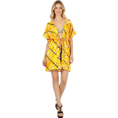 LA LEELA Women's Summer Front Open Holiday Beachwear Mini Bathing Suit Cover ups Duster Vacation Swimwear Cardigan L-XL Yellow, Solid