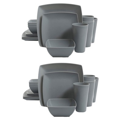 Gibson Home Soho Grayson Square Melamine Everyday 16 Piece Reactive Glaze Dinnerware Set Plates, Bowls, and Cups, Dishwasher Safe, Grey (2 Pack)