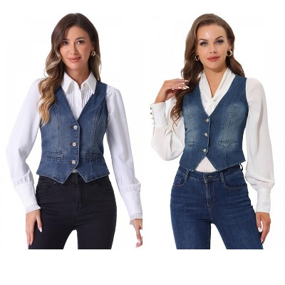 INSPIRE CHIC Women's Denim Sleeveless V Neck Button Down Cropped Jean Waistcoat