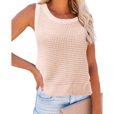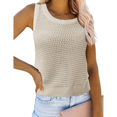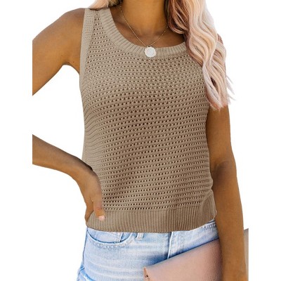 Coolmee Women's Summer Vests Crochet Knit Sleeveless Sweater Round Neck Hollow Out Knit Tank Tops Casual Vacation Cami Tops L Khaki