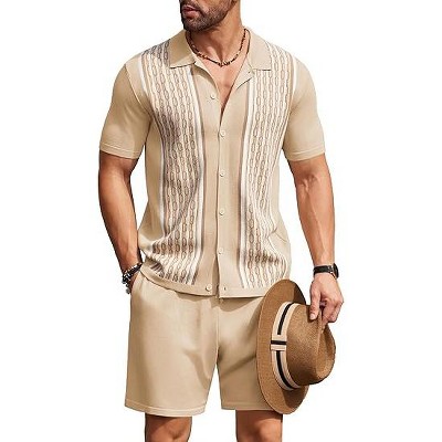 COOFANDY Men's 2 Piece Outfit Vintage Short Sleeve Button Down Knit Polo Shirts Casual Beach Shorts Sets