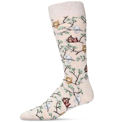 Memoi Men's Embroidered Owls Bamboo Crew Socks Oatmeal