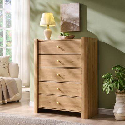 Modern 5 Drawer Dresser with Curved Profile 39.6 "Tall Wooden Chest with Golden Metal Handles Storage Cabinet for Bedroom Living Room Hallway