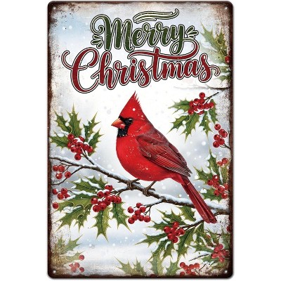 Lomsoe Christmas Cardinal Bird Metal Tin Sign 8x12in "Merry Christmas" Vintage Painting Tin Signs Wall Poster Plaque for Living Room Christmas Gift