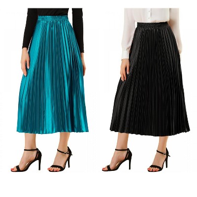 Allegra K Women's Party Elastic Waist Metallic Shiny Pleated Midi Skirt 2 Pcs