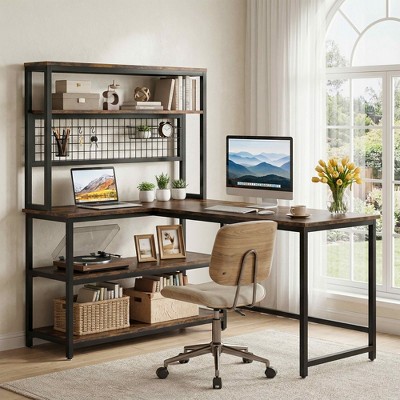 MAYEERTY 55" Large L-Shaped Office Desk with Built-In Charger, Waterproof Dustproof Corner Workstation with Storage Bookshelf for Home & Office