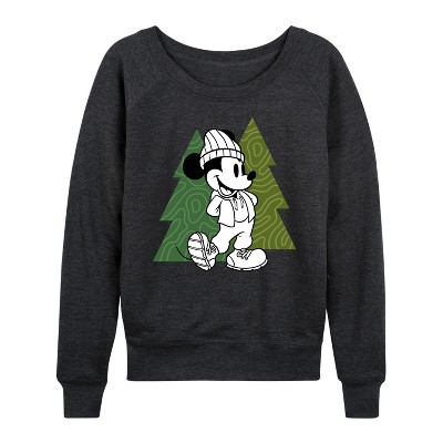 Women's - Disney - Mickey Patterned Trees Lightweight French Terry Wide Neck Long Sleeve Graphic Shirt
