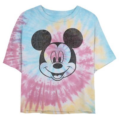 Juniors Womens Mickey & Friends Bright Neon Mickey Mouse Outline Mineral Wash Crop T-Shirt