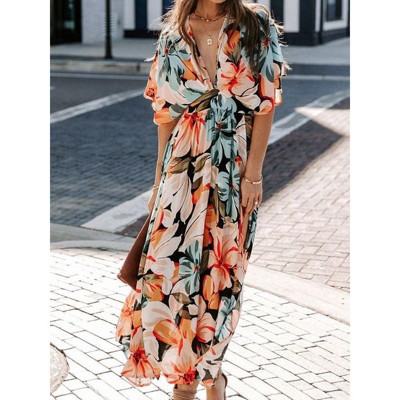 Womens V Neck Lantern Long Sleeve Midi Dress Fake Button Loose Casual Fall Dress