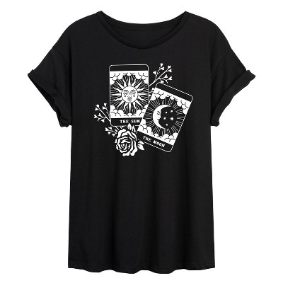 Junior's Lost Gods Celestial Moon Lotus Flower Grayscale Oversized T-Shirt