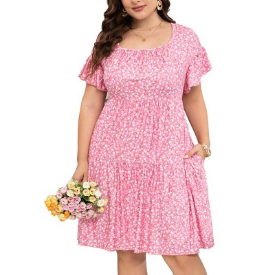 Women's Plus Size Floral V-Neck Dress Short Sleeve Knee Length A-line Mini Dresses