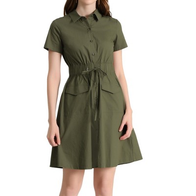 INSPIRE CHIC Women's Point Collar Front Elastic Waist Drawstring Mini Shirt Dress with Pocket