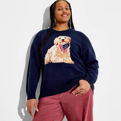 Women's Americana Dog Long Sleeve Graphic Pullover Sweater- Blue