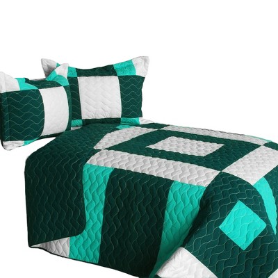 Slickblue Full/Queen 3PC Quilt Set, 100% TC Fabric, Geometric Design, Reversible, Machine Washable, Green/White
