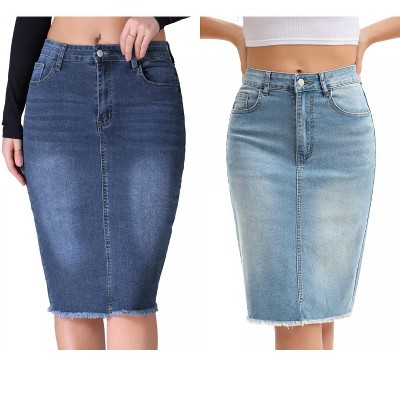 INSPIRE CHIC Women's Raw Hem High Waisted Pockets Stretch Knee Length Jean Denim Skirt 2 Packs