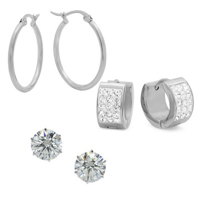 Steeltime Ladies 3 sets stainless steel stud, huggies and hoop earrings