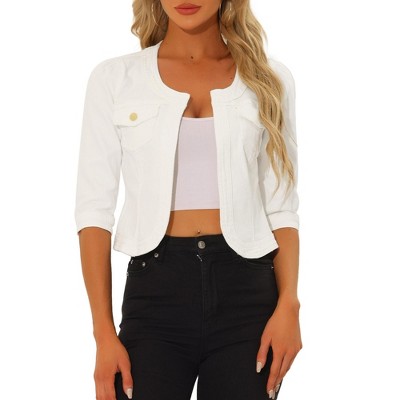 Allegra K Women's 3/4 Sleeve Zipper Pockets Collarless Blazer