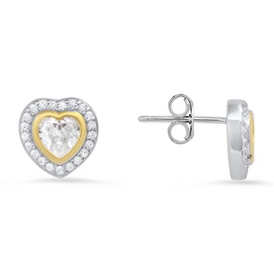 Sterling Silver Two-Tone CZ Heart Halo Stud Earrings