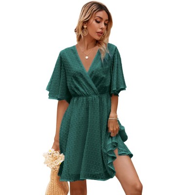Women's Knee Length SwissDot Dress Short Sleeve v Neck Smocked Chiffon Midi Dress Summer Baby Doll Dresses