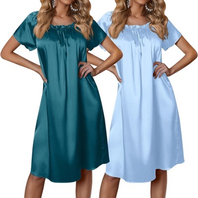 Ekouaer Satin Nightgowns for Women 2 Pack Silk Nightgown Pleated Loose Night Shirts Short Sleeve Sleep Shirts
