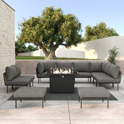 LayinSun 11 Pieces Rope Woven Patio Furniture Set, Modern Modular Sectional Sofa with Fire Pit Table and Upgrade Thickness Cushion