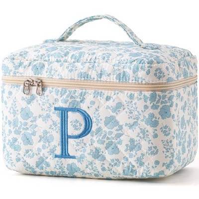 Narwey Initial Quilted Makeup Bag, Cute Floral Coquette Make up Bag Cosmetic Bag Toiletry Bag for Women Girls P