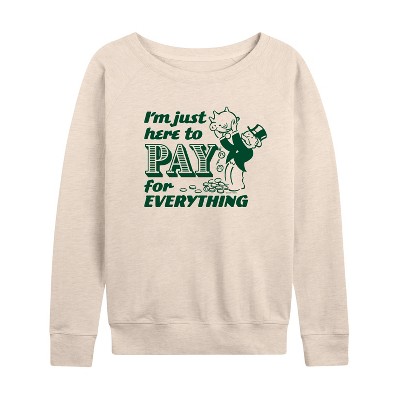 Women's - Monopoly - I'm Just Here To Pay Lightweight French Terry Wide Neck Long Sleeve Graphic Shirt