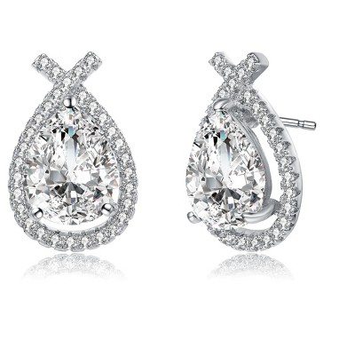 Bar Drop Earrings — .925 Sterling Silver, Rhodium Plated, Cubic Zirconia Pear Shape Stone, Day to Night, Lightweight