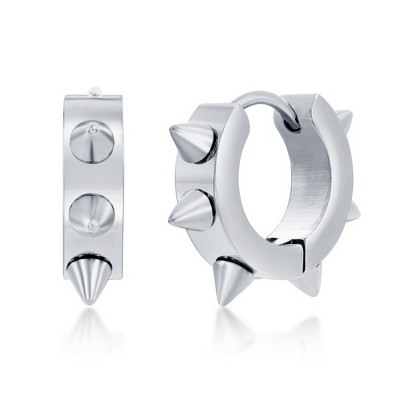 Metallo Mens Stainless Steel 19mm Spike Huggie Hoop Earrings - Silver